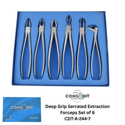 ₹22,000.00Original price was: ₹22,000.00.₹15,000.00Current price is: ₹15,000.00.The CONODENT 6-Piece Deep Grip Series is a specialized selection of extraction forceps designed for clinicians who prioritize mechanical stability and subgingival access. By combining internal micro-serrated beaks with external serrated handles, this set provides a dual-layer anti-slip system. This specific configuration (1F through 7CF) covers the essential anatomy of both adult and complex root cases with superior "bite" on the tooth structure. -