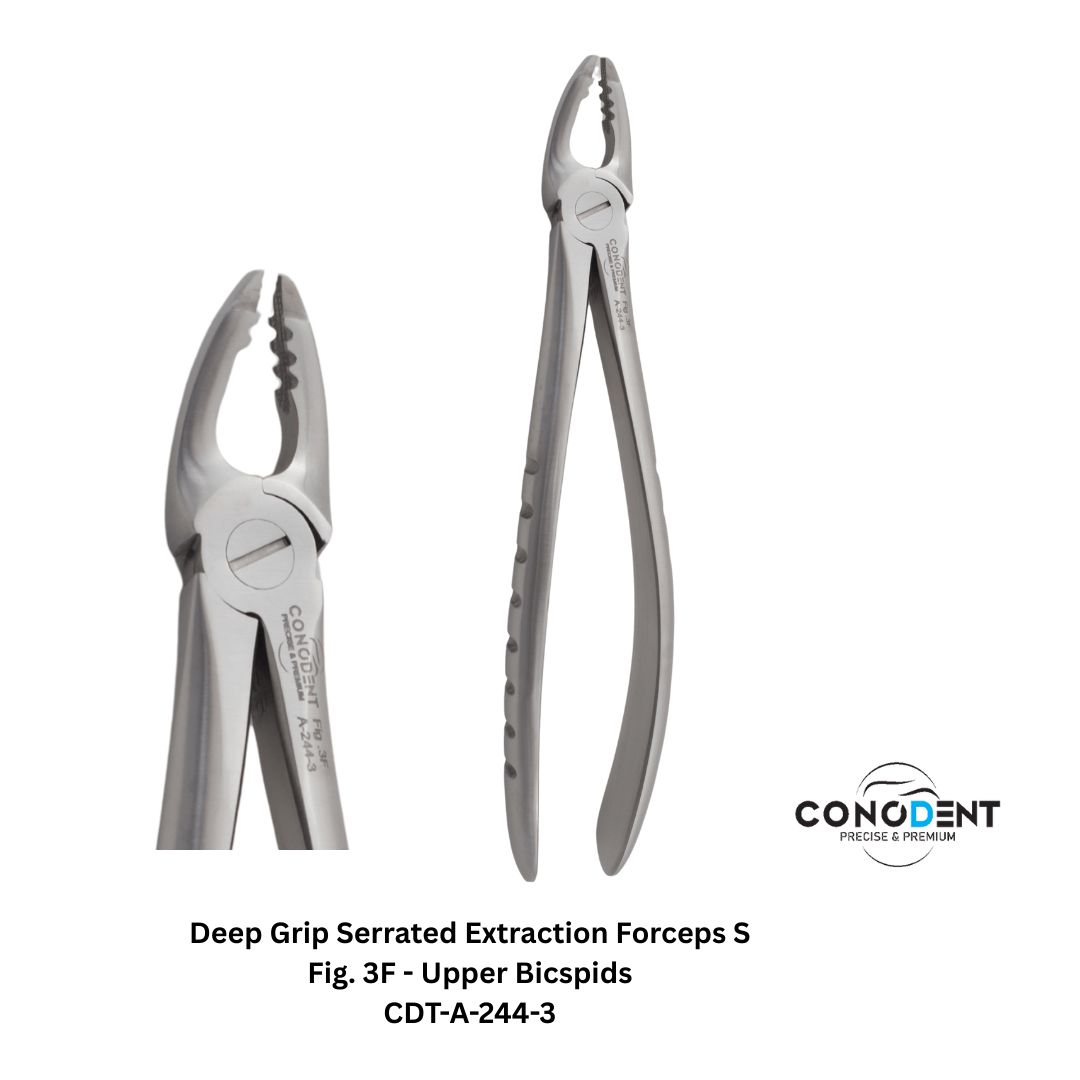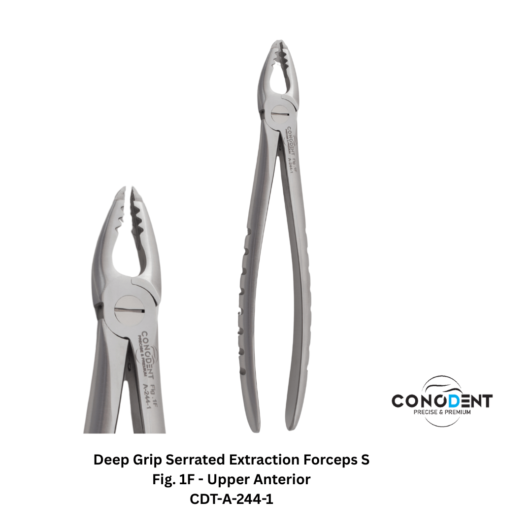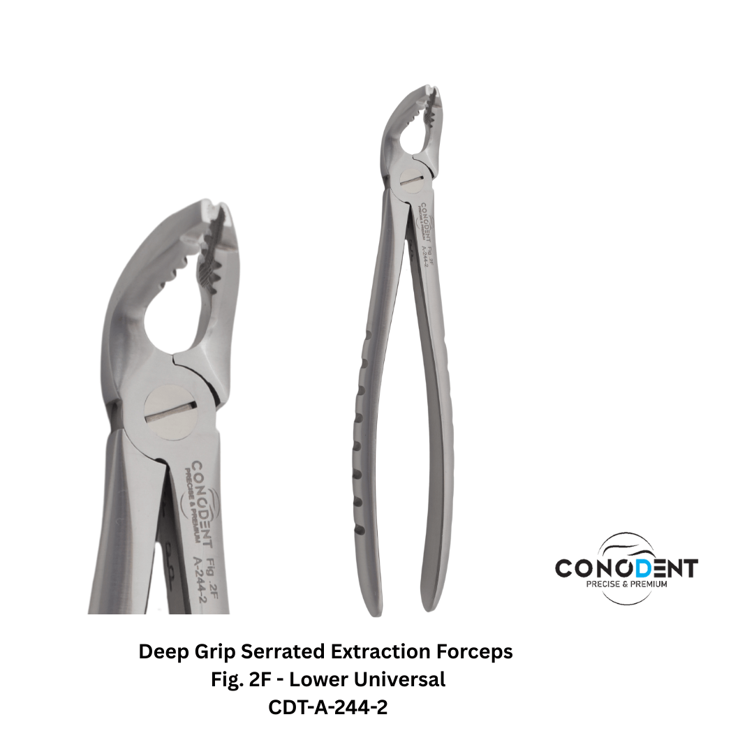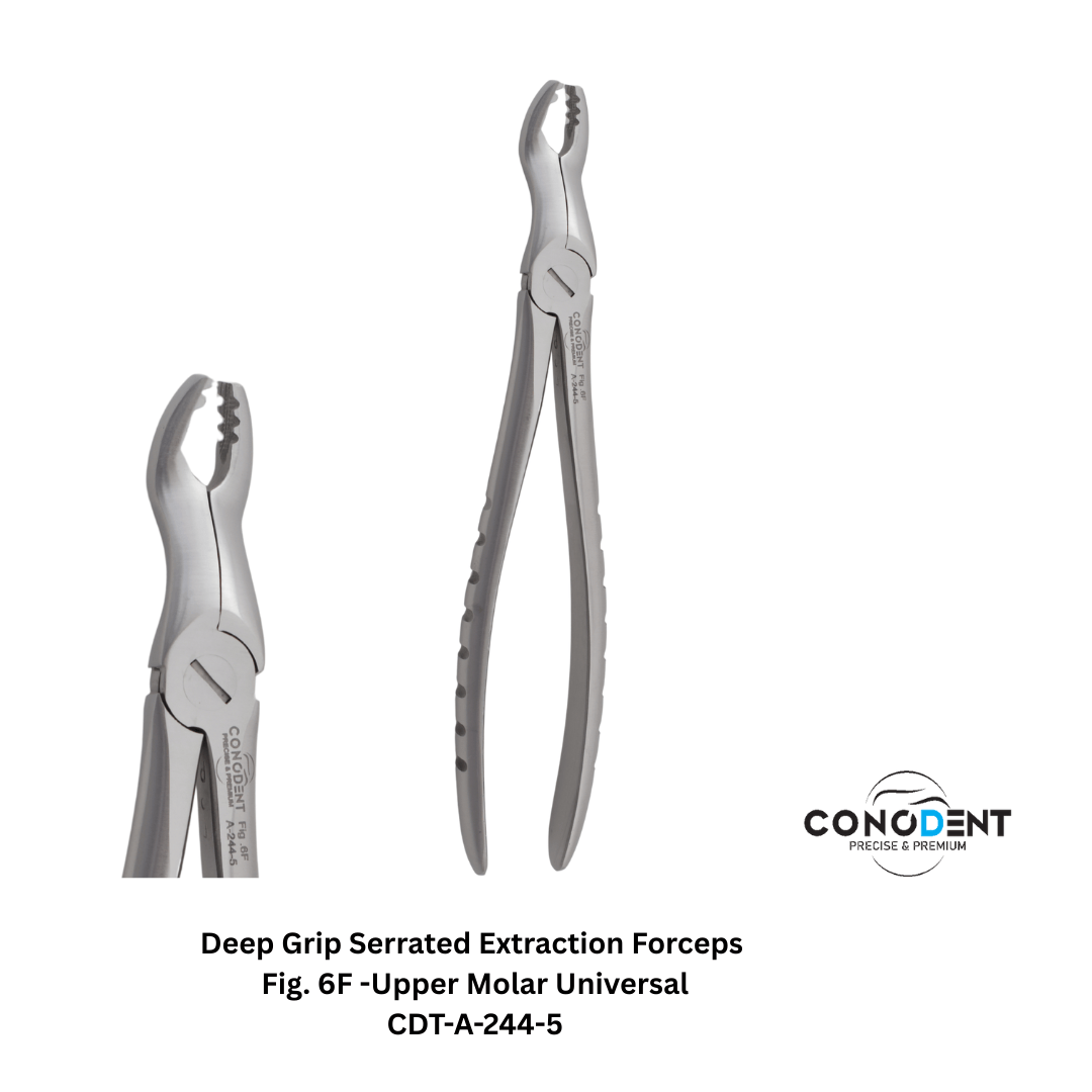 The CONODENT 6-Piece Deep Grip Series is a specialized selection of extraction forceps designed for clinicians who prioritize mechanical stability and subgingival access. By combining internal micro-serrated beaks with external serrated handles, this set provides a dual-layer anti-slip system. This specific configuration (1F through 7CF) covers the essential anatomy of both adult and complex root cases with superior "bite" on the tooth structure.