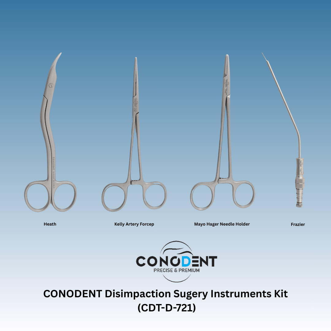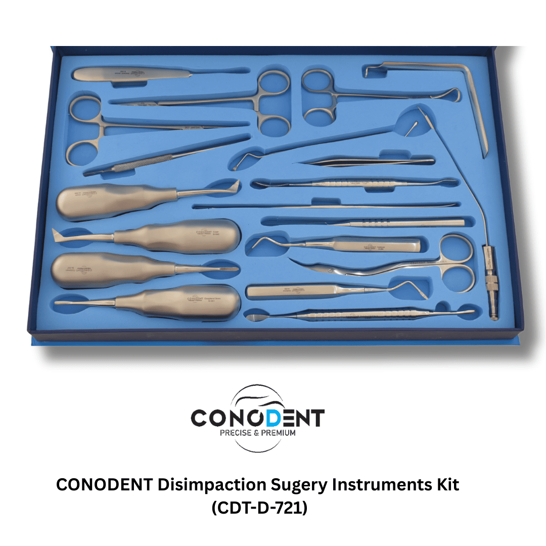 The CONODENT CDT-D-721 is an elite, 20-piece surgical system engineered specifically for complex disimpaction procedures and the removal of deeply embedded third molars. This comprehensive kit provides a seamless clinical workflow—from initial vestibular access and flap reflection to bone guttering, tooth sectioning, and precise wound closure.