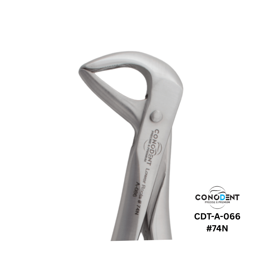 The Conodent Figure 74N is a specialized variation of the classic lower root forceps, designed with extra-narrow beaks for the precise removal of mandibular (lower) roots and fragments. This model features a traditional English Pattern handle with a professional matt finish, providing clinicians with maximum visibility and a glare-free experience during delicate surgical procedures.