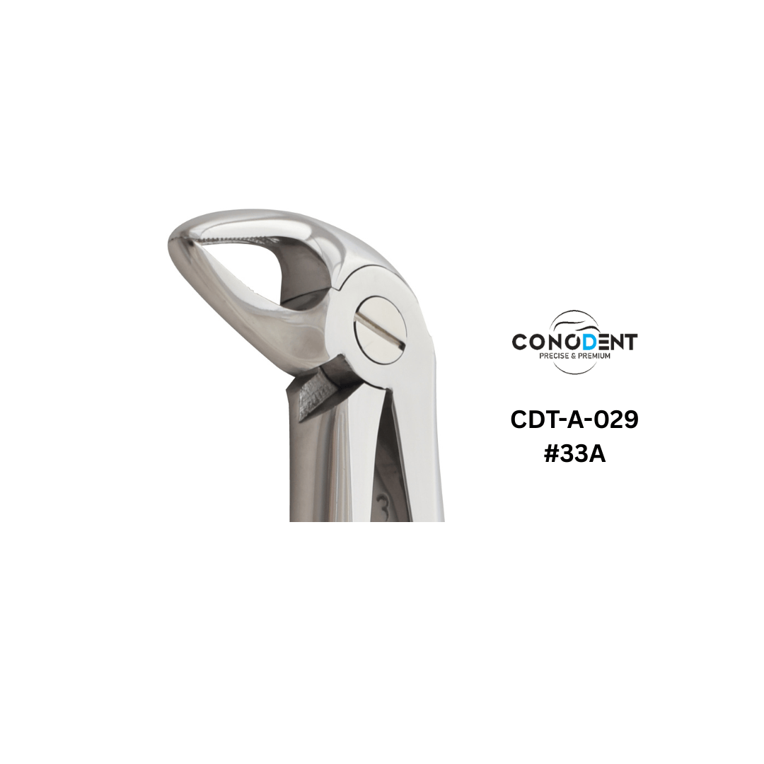 The Conodent Figure 33A Extraction Forceps are the professional standard for the removal of mandibular (lower) roots and fragments. Featuring an optimized beak angle and slim profile, this instrument allows for precise control and deep access within the lower arch.
